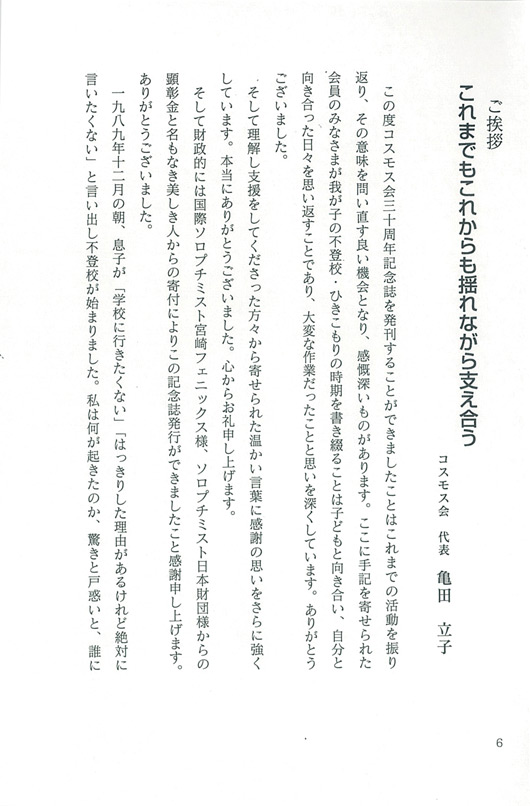 不登校の子どもを持つ親の会活動を開始して30年を機に私どもの思いや足跡を残すことで、改めて子どもに向き合う機会になり同様の思いを抱えている方や関係者の方のお役に立てるのではないかと記念誌を作成することになりました。素人集団での編集作業は困難なこともありましたが各々の思いを大切にしながら、子どもたちのイラスト提供もあり完成に至りました。ソロプチミスト様の顕彰をいただいた事で実現でき感謝しております。