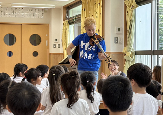 教育・福祉・防災の3本柱を軸に高齢者施設や保育園などでのボランティア演奏や、小学校や中学校で自身のいじめや不登校の経験を元に人権の大切さを伝える講演や演奏会を行う。東日本大震災以降、被災地での慰問演奏や復興支援のチャリティーコンサートを開催。奇跡の一本松や震災で廃棄された家具を再利用して作られたヴァイオリンを託され、活動を続けている。