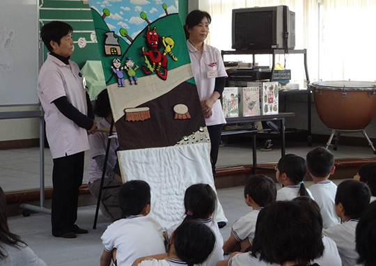 出産準備教室での読み語りから活動を始め、保育所、小学校、放課後児童クラブなどで、これまでに約230回のおはなし会を行ってきた。絵本の読み語りや昔話の素語り、手遊びやわらべ歌など、訪問先や会の目的に合わせ、最後まで楽しめるように工夫している。準備や練習の時間調整などで大変なこともあるが、参加者と楽しい時間を過ごすことが活動の原動力になっている。